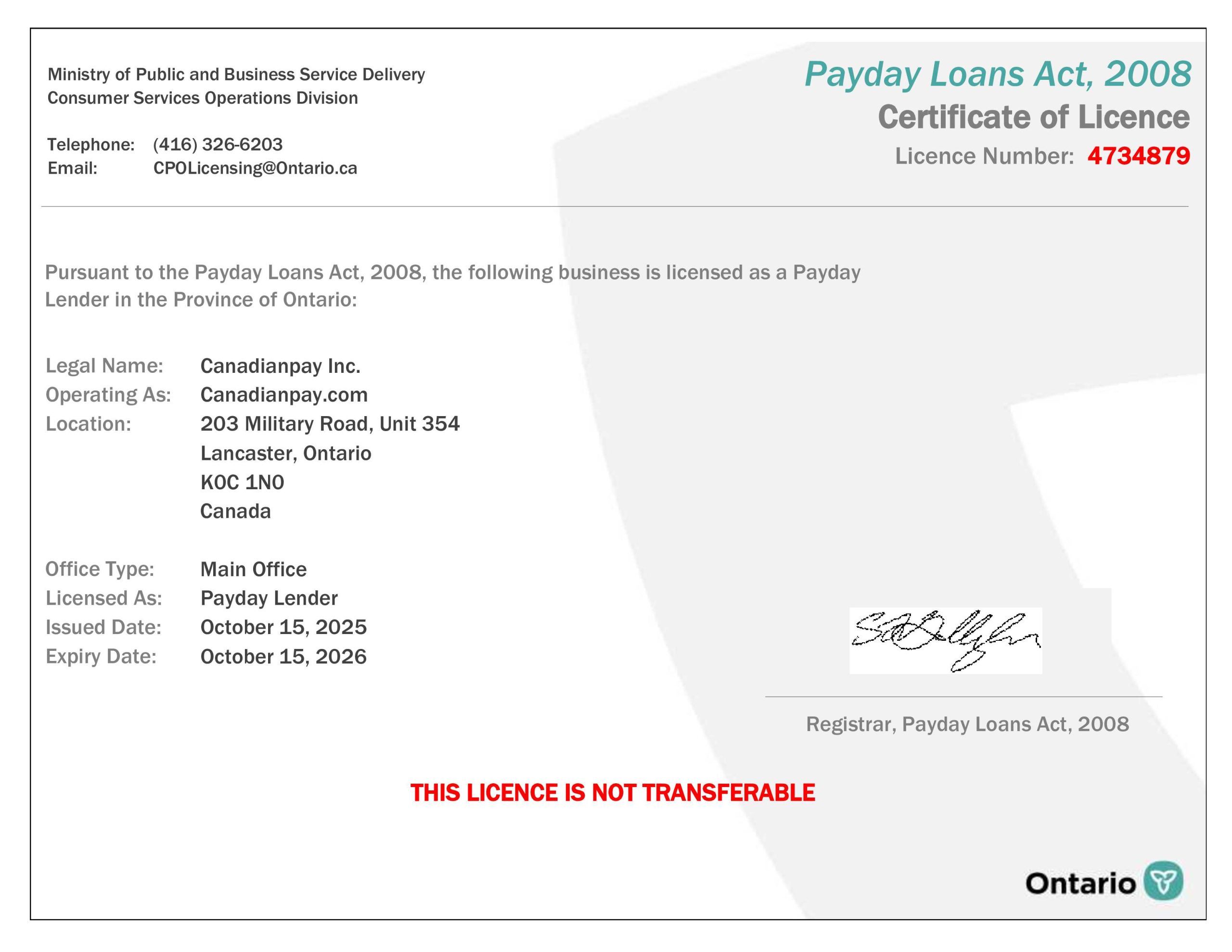 CanadianPay.com is a Responsible Lender and has guidelines in place that promote a better lending environment. We will not extend loans that we believe you will not be able to repay. Don’t use unethical lenders who have no regard for your well being. Here at CanadianPay.com, we care about our customers. Thank you for choosing CanadianPay.com as your lender of choice. We value your business.